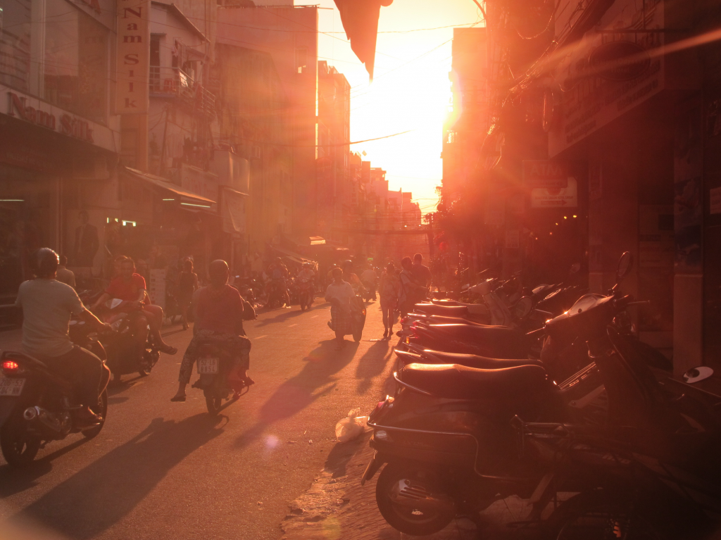 Der in etwa 700 Meter (ähem..hab nachgeschaut: 230 m) weite Nach-Hause-Weg wäre wahrscheinlich nicht möglich gewesen, hätten wir nicht schon 35 Stunden Training im Saigoner Straßenverkehr gehabt! Einfach gehen. Langsam und beständig. Ohne Angst. Die anderen fahren gewiss um dich herum. Stutzen oder springen nur im äußersten Notfall!