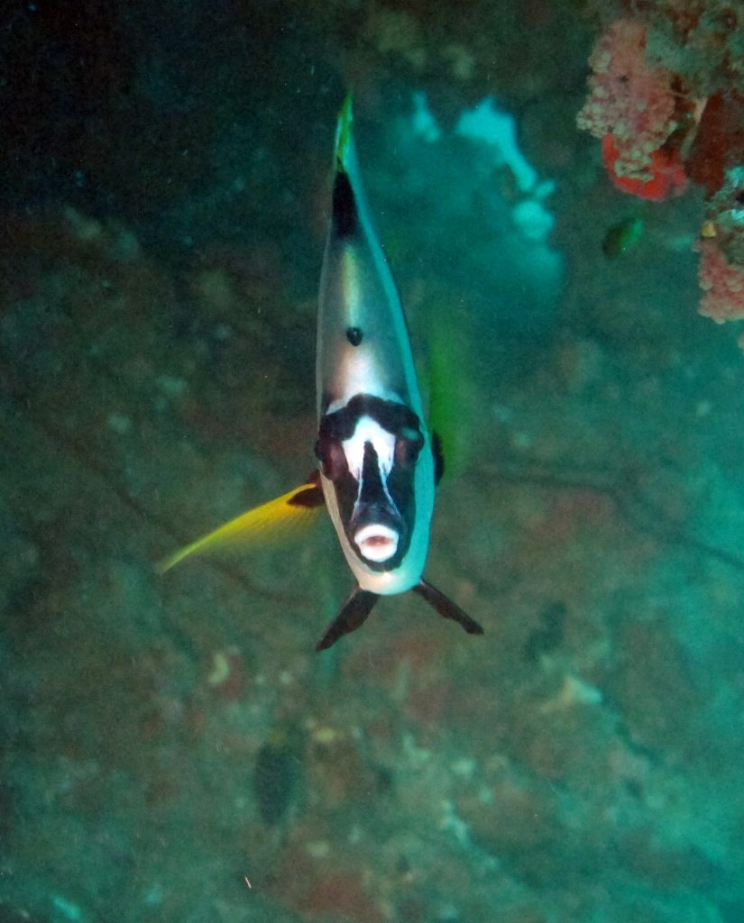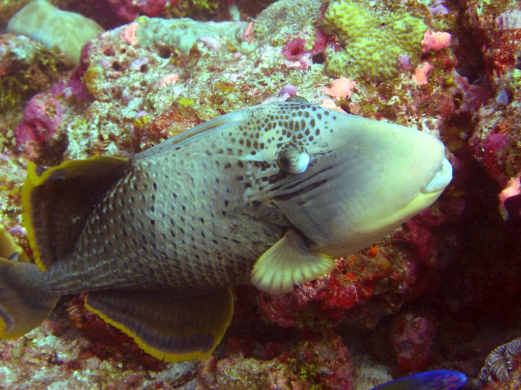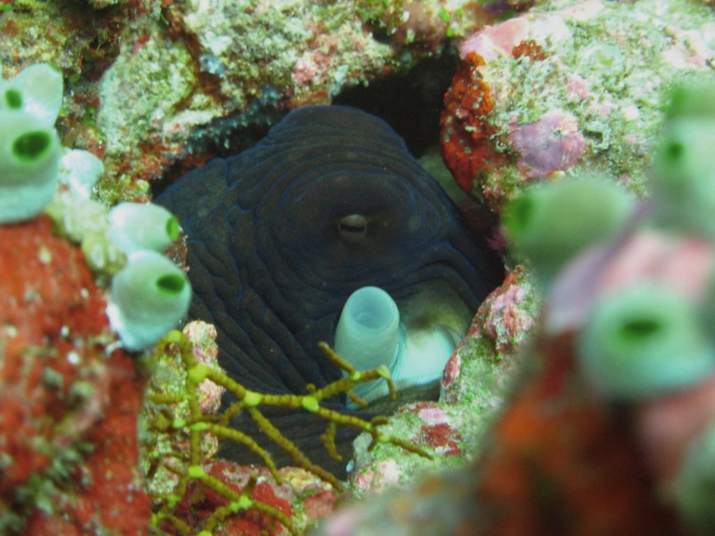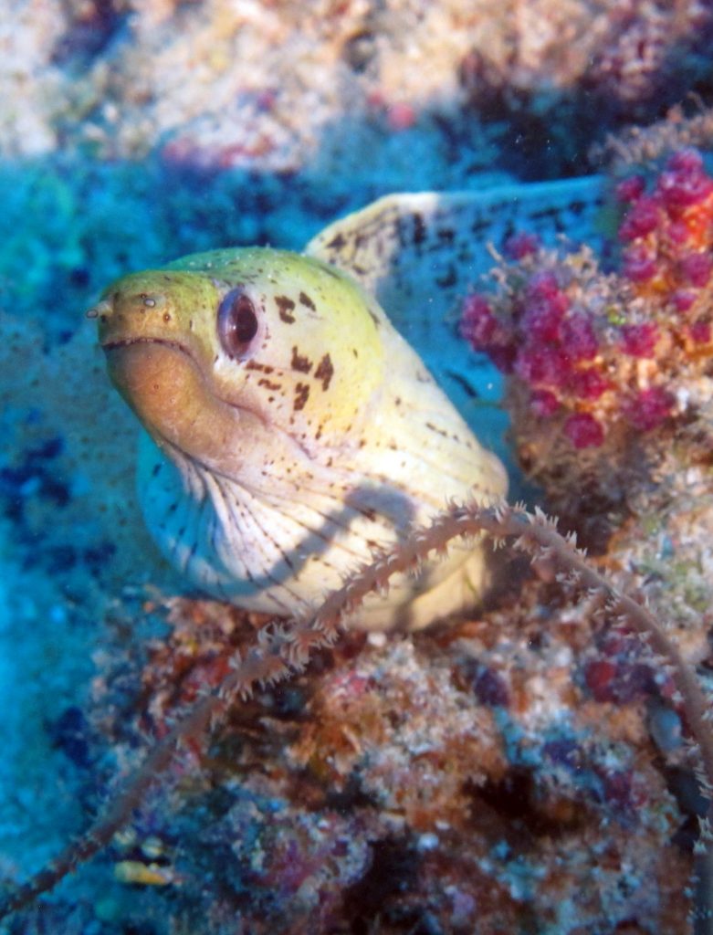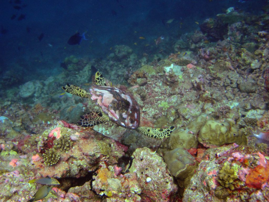 ..den hab ich gefilmt und verfolgt!morgens…6 Uhr …tauchen…..wir sitzen im Riff…?!?!viel los da untendie Emperor Atoll und unsere Luna (Dhoni)…warum drumherum kriechen?!..das Knotige da ist ne Schnecke