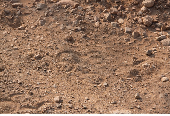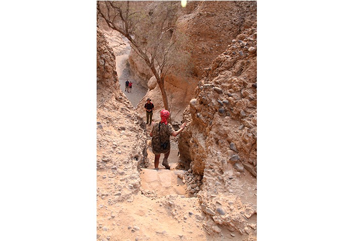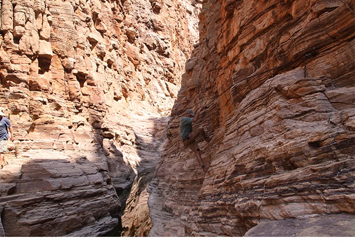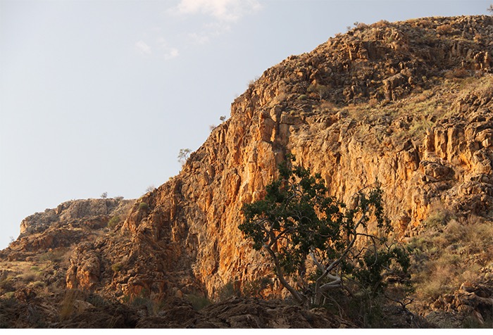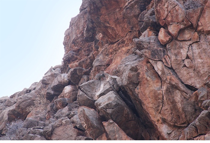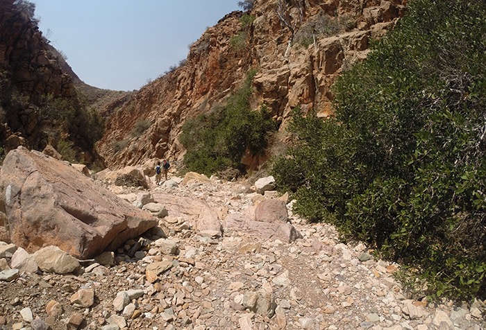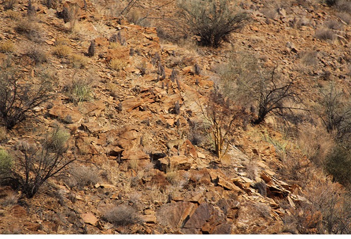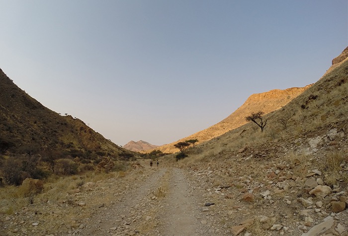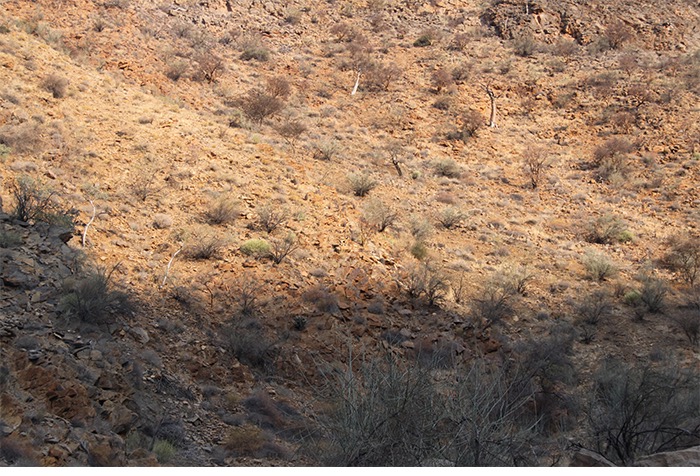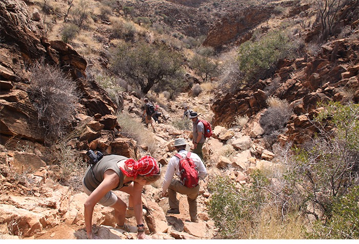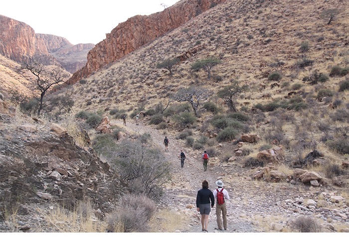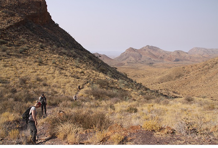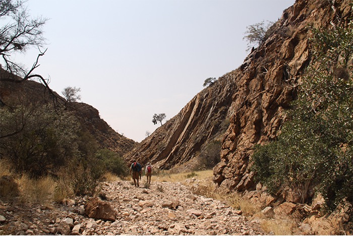 Gut 17 Kilometer lang ging es entlang des Naukluft-Olive-Trails den Berg hoch und wieder runter, über Felsen, von Stein zu Stein, an einer installierten Kette waagerecht entlang der Steilwand und gelegentlich auch im Team kraxelnd einige Höhenmeter überwindend. Zahllose Spuren im Sand oder abgenagte Knochenreste und körperlose Hufe am Wegesrand ließen uns auf Begegnungen mit Bergzebras hoffen; aber es blieb bei Kleinstgetier von Heuschrecken, Ochsenfroschkaulquappen und Schmetterlingen.