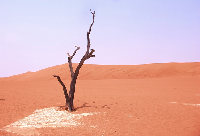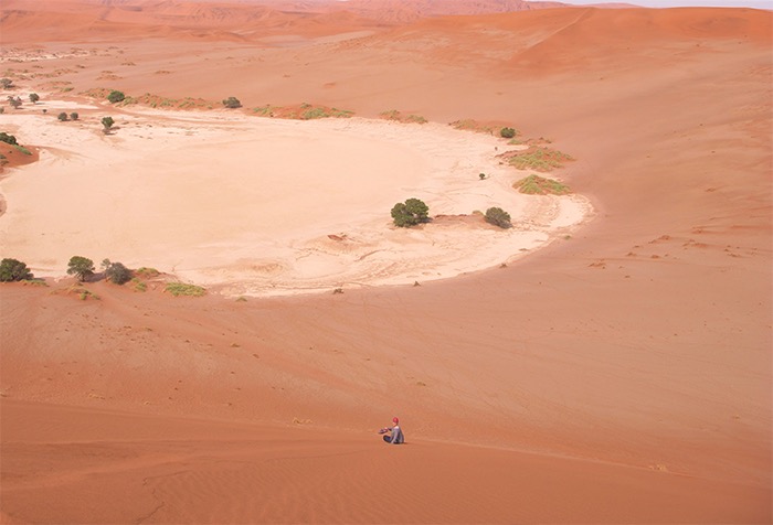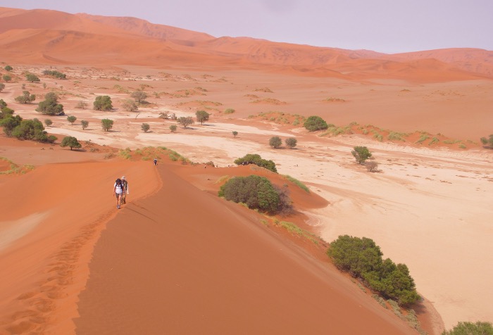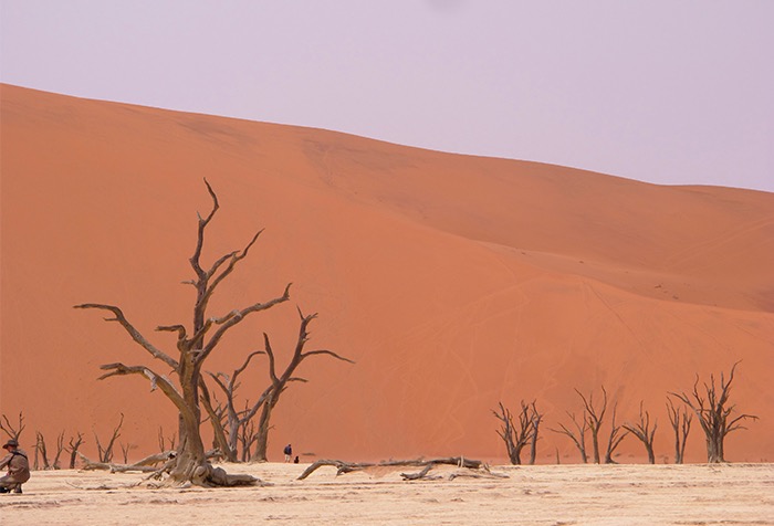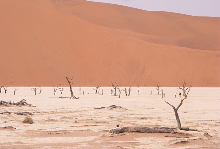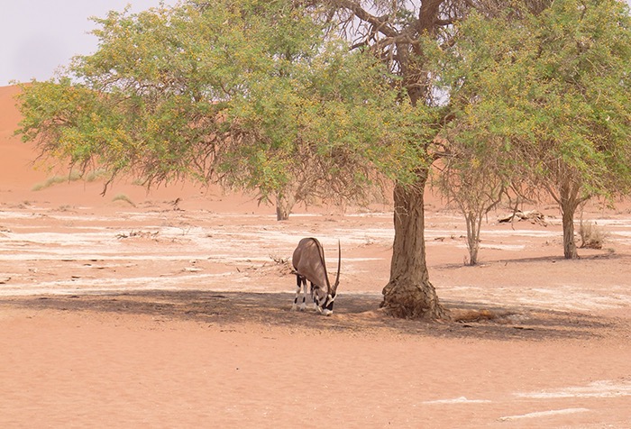 Umso mehr beeindrucken diese abgelegenen Landschaften! Die zerklüftete Steinformationen des Sesriem Canyons, die plötzlich den Boden zu spalten scheinen, die roten Eisenoxid-gefärbten Dünen des Sossusvleis mit bis zu 170 Meter Höhe, verkohlt wirkende Bäume in der Salzpfanne des Deadvleis, dazu hier und da eine einsame Oryx-Antilope und eine unendliche Weite voller Sand und hitzeflimmernder Endlosigkeit. Und wir mitten drin!