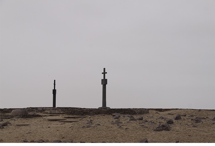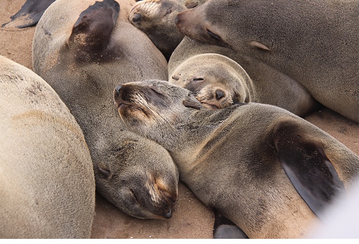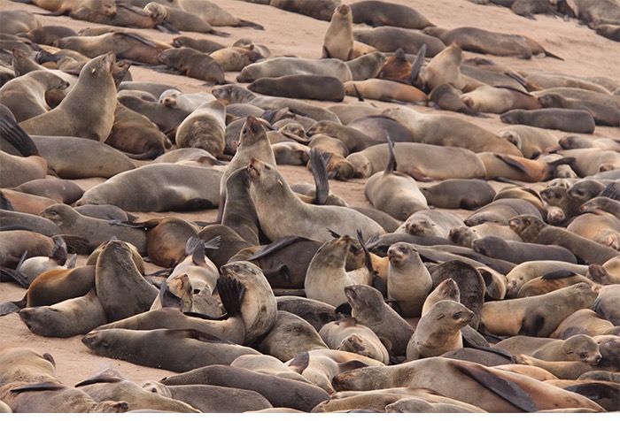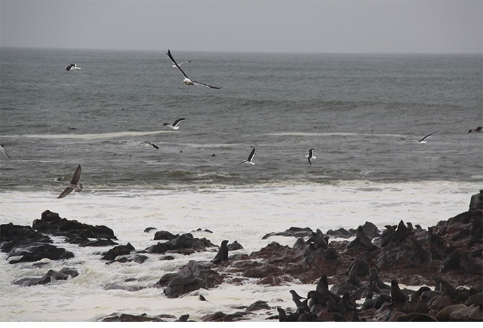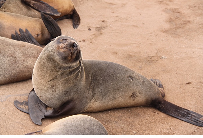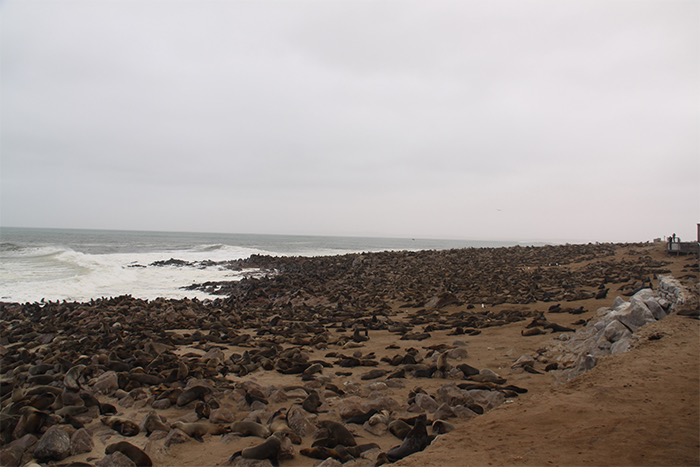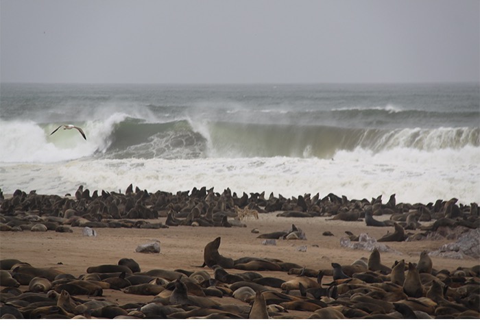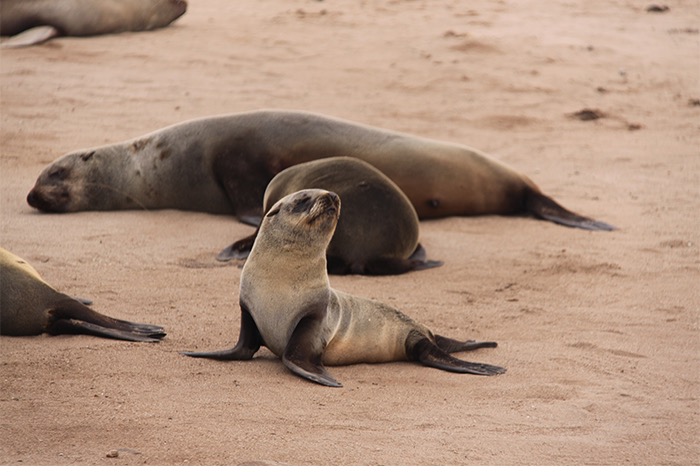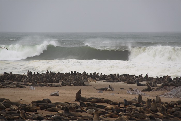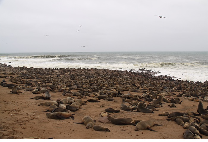 Nach der frischen Küstenluft mit Betten, Strom und Menschen ging es entlang des Atlantiks nach Cape Cross. Der Portugiese Diogo Cão meinte 1486, dass er nun die Spitze Afrikas erkundet hätte und schlug sein Fähnchen, ähm Steinkreuz, in den Boden. Vielleicht war er auch nur reisemüde und hatte die vielen ansässigen Seehunde (angeblich bis zu 100.000) vom Meer aus falsch interpretiert. Der Name blieb, die Seehunde auch. Und die liegen da und blöken non-stop wie wütende Ziegen. Jeder ruft. Jeder antwortet. Und alle riechen grenzwertig fischig bis verwesend. Aber wenn man die Geruchsproblematik einmal im Griff hat, ist dieses Gemecker, Gebelle, Gerobbe, Gerangel und Gechille extremst unterhaltsam!
