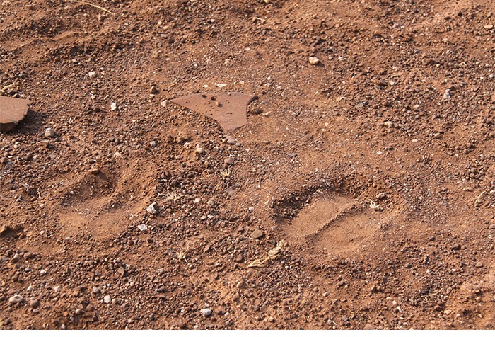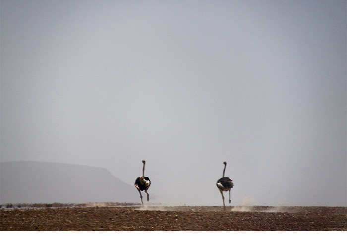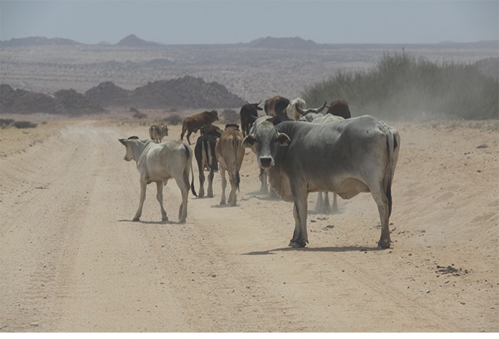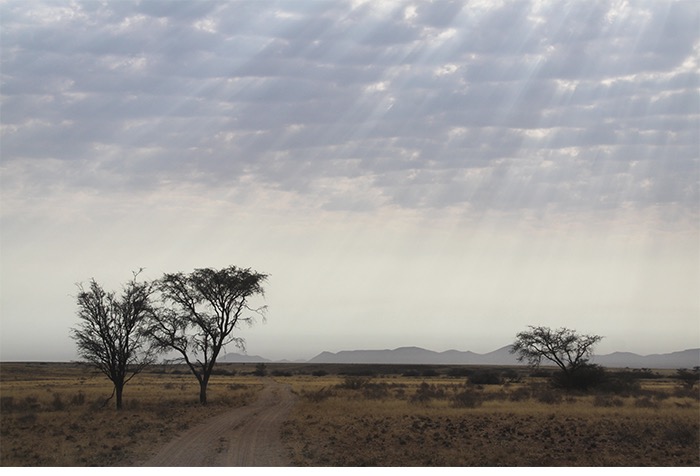 Und dann ging es ab gen Messum-Krater und Brandberg in das trostlose Dessolation Valley. Eine Schotterpiste – oder wie man in Namibia sagt : Pad –, welche nicht ohne Allradantrieb gefahren werden sollte. Leere, Weite, Staub. Gefühlte Lichtjahre entfernt von der Zivilisation. Die Kilometer rollten an uns vorbei. Manchmal konnte man zwei einsame Springböcke am Horizont wandern sehen; mal ein Oryx, mal einen Strauß, mal stand da ein Baum. Das Land schrie „Wasser-Knappheit!“.