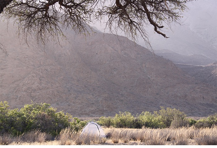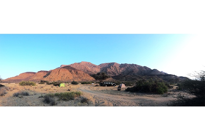 Unser Tagesziel war es irgendwo nahe des Brandberg-Massivs, welches mit dem Königstein von 2573 Metern, die höchste Erhebung Namibias umschließt, einen schönen Platz für unser Lager zu finden, bevor wir am Folgetag wieder in erschlossenere Gebiete zurückkehren würden. Als navigierender Beifahrer fiel diese Ehre mir zu. Und so erspähte ich einen hübschen Kameldorn-Baum, der etwas Schatten für den Hänger versprach und eine atemberaubende Sicht auf den Brandberg bot.