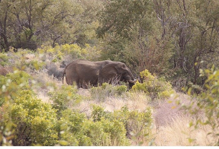 Dort gab es Campingparzellen mit beschatteten Aussichtsplattformen gen Revier (Trockenflussbett), wo wir wieder einmal in der glücklichen Situation waren einem Elefantenbullen beim Frühstück zuzuschauen. Auch stand eine morgendliche Pirsch an mit Fährtenlesen, Losung unterscheiden und Aussicht genießen. Diese endete allerdings recht abrupt als wir im mannshohen Gras frische Löwenspuren fanden. „Alle bleiben zusammen, zack zack“ und ab in die gegengesetzte Richtung. Das sind so die Momente, wo einem noch einmal verdeutlicht wird, dass man wirklich in Afrika und nicht im Serengetipark ist.