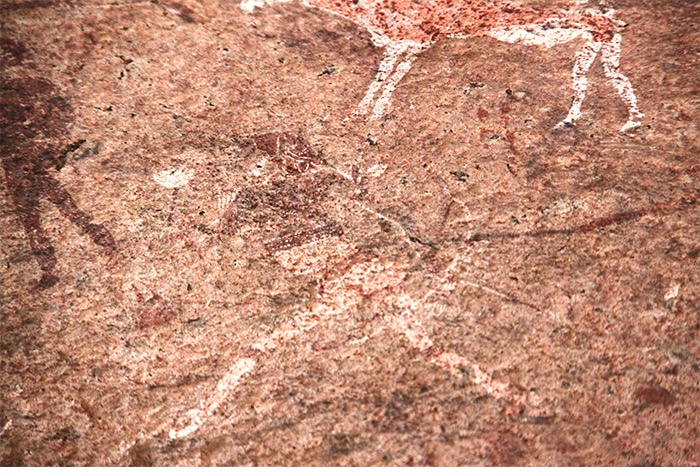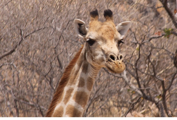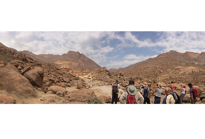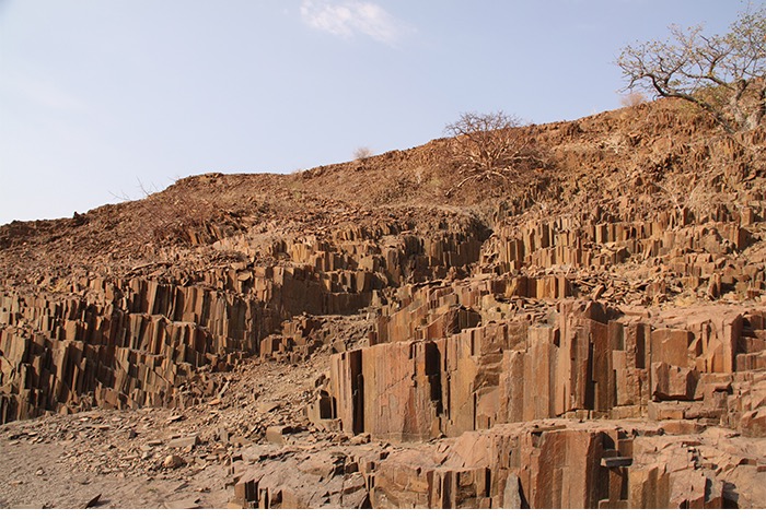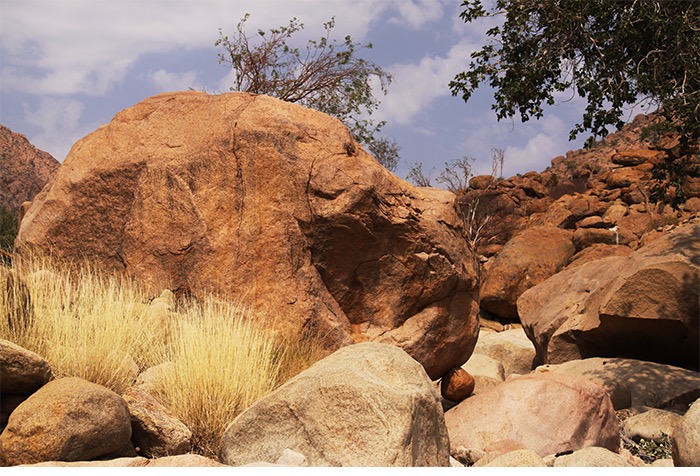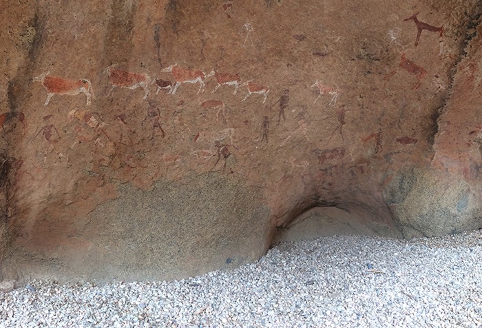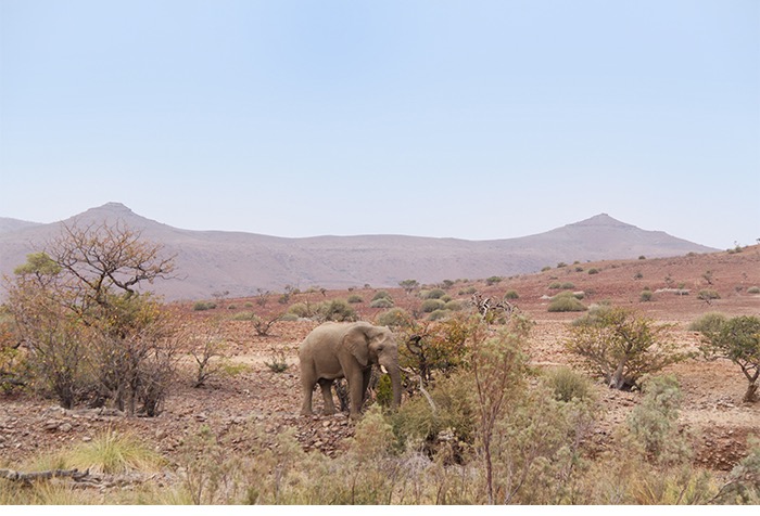 In den folgenden Tagen wurden uns die Felsmalereien der Weißen Dame (die doch ein männlicher Jäger war), die Felsgravuren von Twyfelfontein, der verbrannte Berg und die sogenannten Orgelpfeifen präsentiert. Für den Banausen also nur viel roter Stein, mal eckig, mal dunkel, mal zerkratzt, mal bemalt. Aber zur Freude unserer Gruppe hatte sich ein alter Elefantenbulle an den Brandberg in die Tsibab-Schlucht verirrt und futterte entspannt ca. 150 Meter von unserem Spazierpfad entfernt das Grün ab. Definitiv ein Highlight!