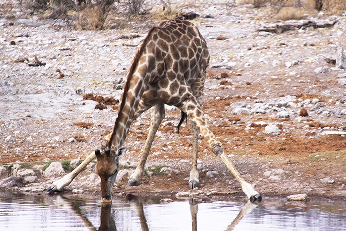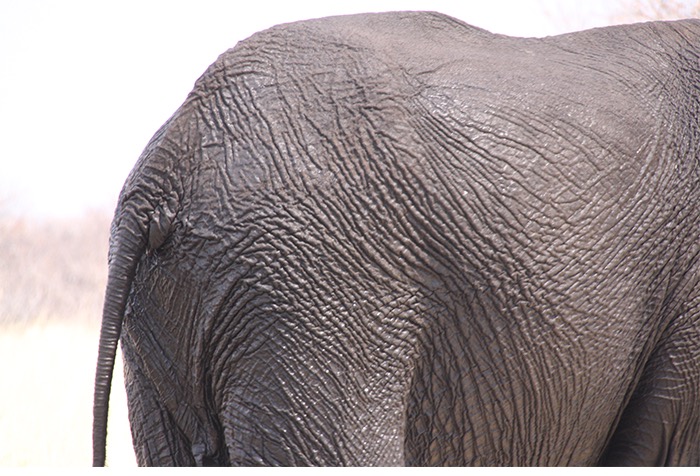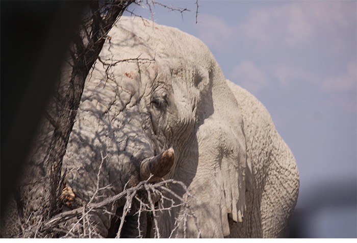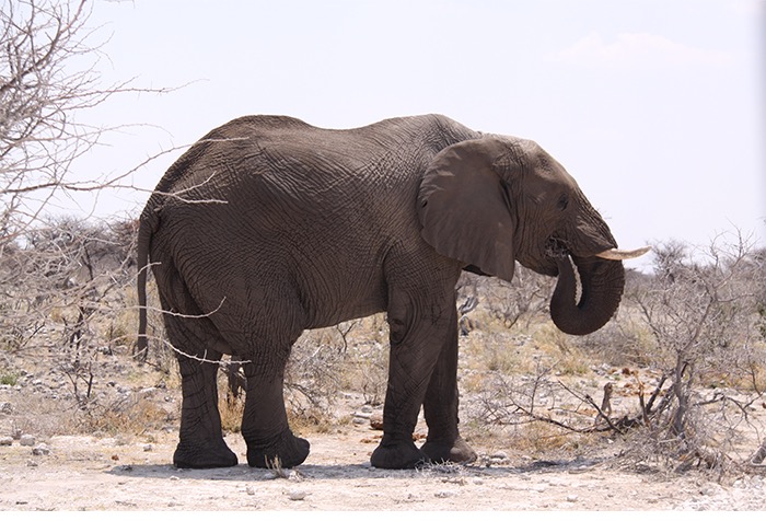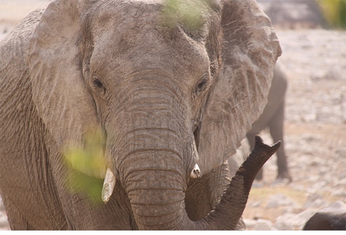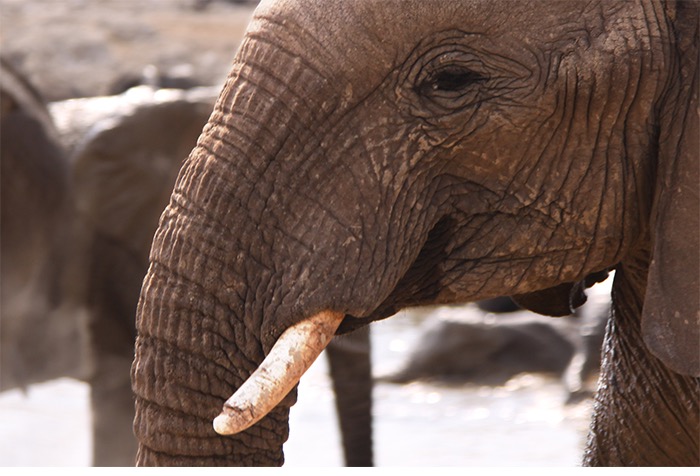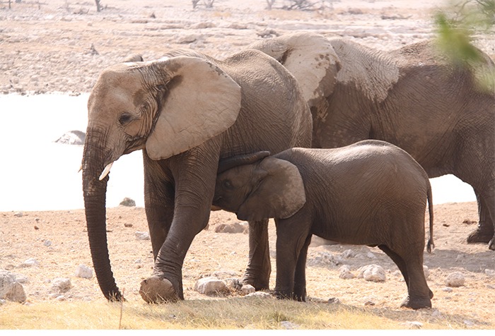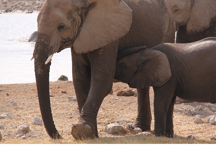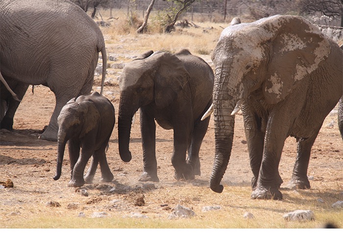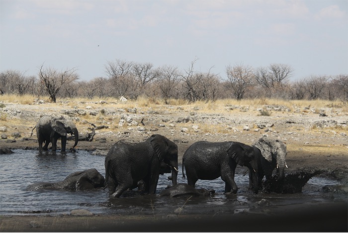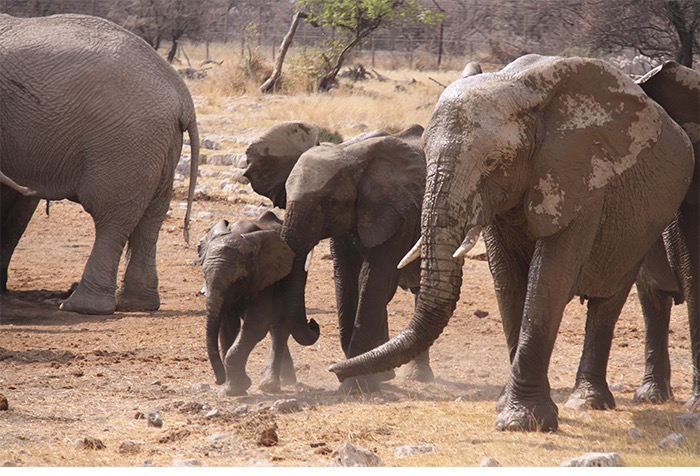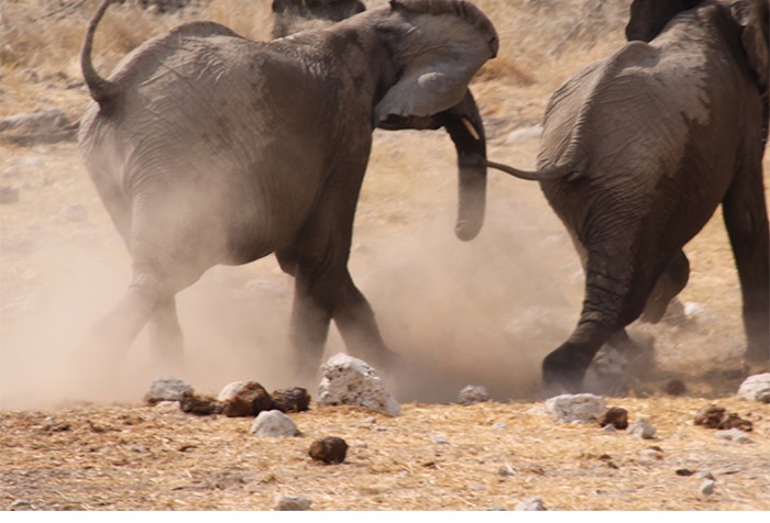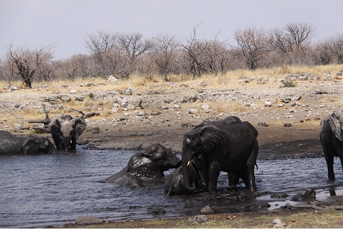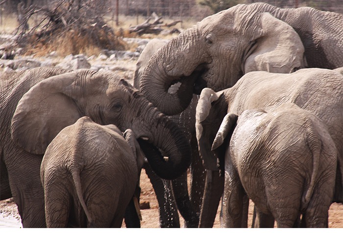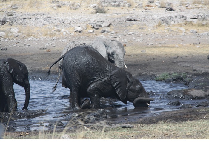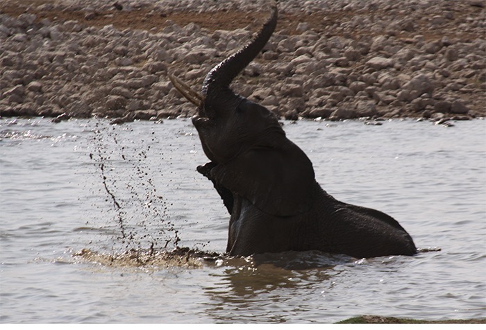 Viele weitere tolle Eindrücke folgten noch an diesem Tag: Elefanten beim Bad, die seltenen großen Eland-Antilopen, Giraffen und ein paar Schildkröten im Wasserloch. Bis wir in unserem Camp in Okaukuejo ankamen, waren die meisten von uns wohlig zufrieden und beendeten den Tag am hiesigen Pool. Nicht so ich. Mir fiel ein großer Elefantenbulle auf, der in Richtung des Lodge- und Camp-Wasserlochs wanderte und so folgte ich seinem Beispiel. Aber genau wie ich war der Bulle spät dran; zwei Herden mit insgesamt 46 weiteren Elefanten jeder Altersstufe planschten, rangelten, dösten und tranken bereits hier. Entlang der Lodge-Aussichtsmauer an die 70 glücklichen Beobachter. Das war wirklich ein wunderschönes Schauspiel, bei welchem ich mir immer wieder in Erinnerung rufen musste, dass ich nicht im Zoo bin