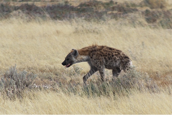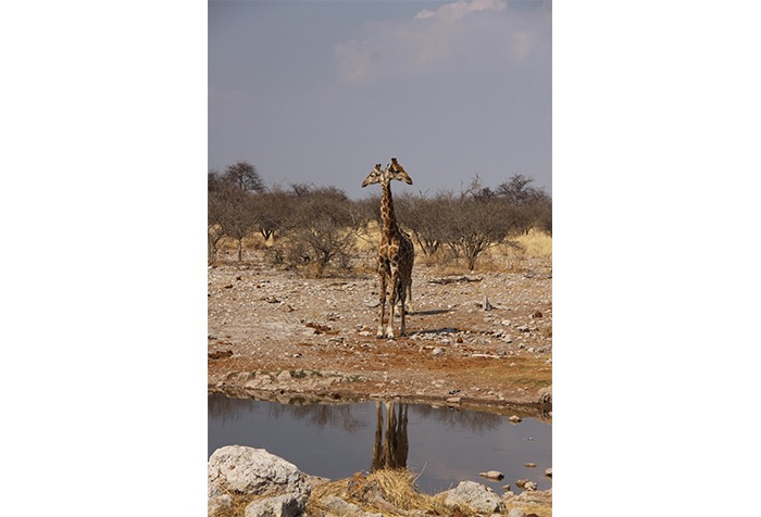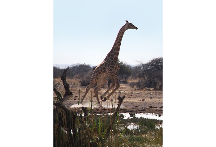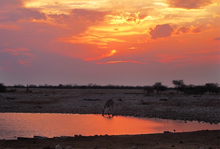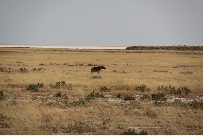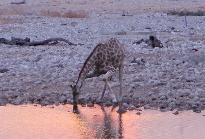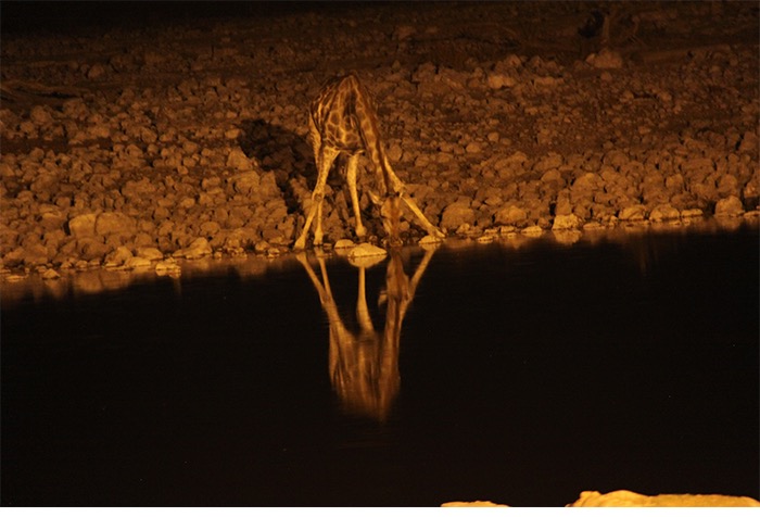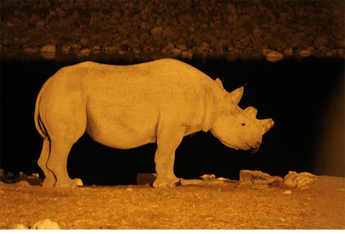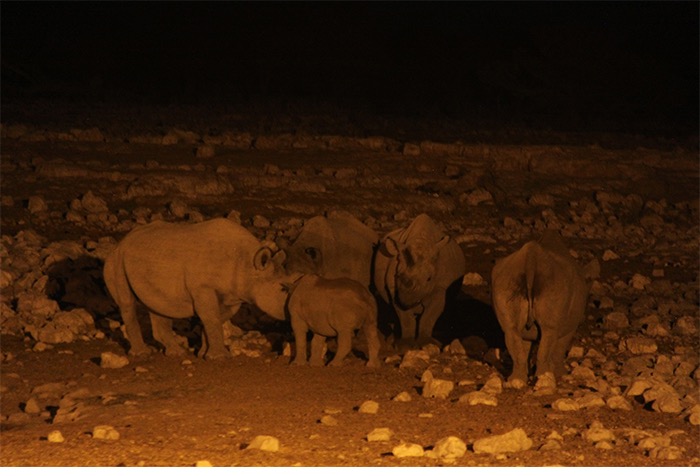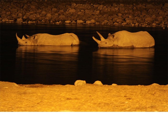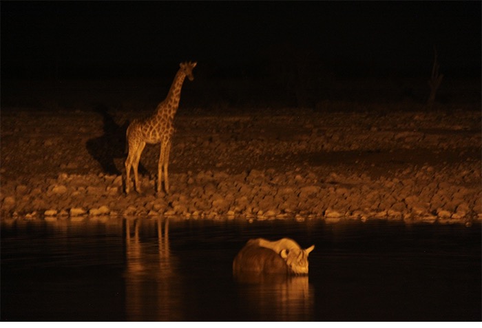 Später am Abend waren noch verschiedene Giraffengruppen zu sehen, die sich voller innerer Unruhe versuchten zum Wasser herunterzubeugen. Auch konnten wir zwei einzelne Spitzmaul-Nashörner beobachten. Und nach 22:30 Uhr, als nur noch wenige Gäste wach waren und Schakale, Löwen und Hyänen heulten und riefen, konnten wir erst eins, dann zwei weitere und zum Schluss Mutter und Kind Nashorn beobachten, die sich neugierig am Wasserloch kennenlernten und ein Bad nahmen. Die lauernde Tüpfelhyäne wiederum wurde von zwei Schakalen in ihre Schranken gewiesen. Das fühlte sich nach Wildnis an!