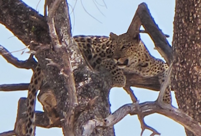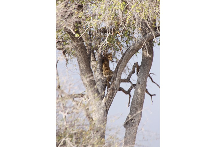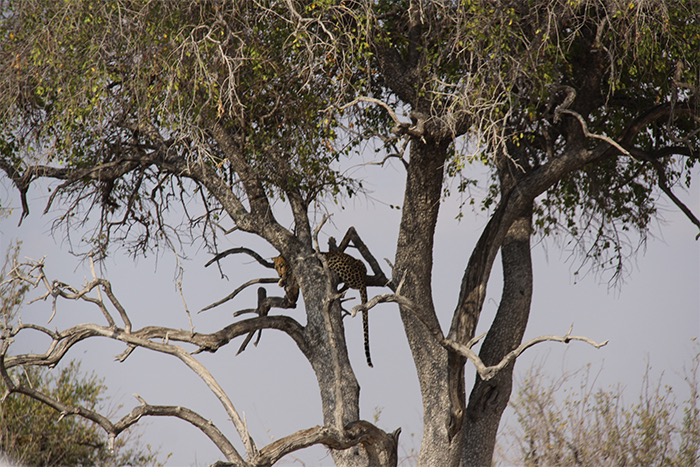 Zum Pirsch-Abschluss besuchten wir noch einmal „unseren“ Leoparden. Und wäre da nicht ein schicksalhafter drehender Windstoß gekommen, wären wir auch Zeuge geworden wie eben dieser ein Schwarznasen-Impala reißt. Aber sie konnten den Jäger in letzter Sekunde wittern und blieben vorsichtig, sodass die Raubkatze sich schließlich wieder hinlegte und auch bald ihren Baumthron aufgab. Sie kletterte herab und zog sich in das Unterholz zurück. Tierdoku hautnah!