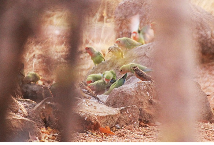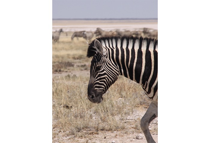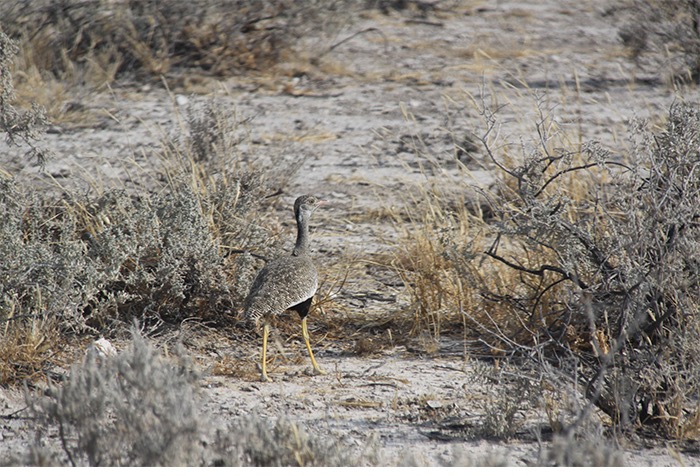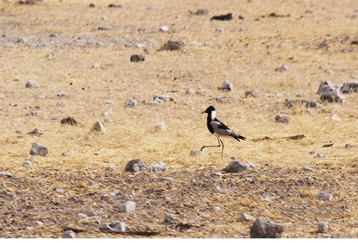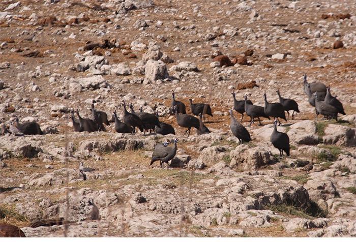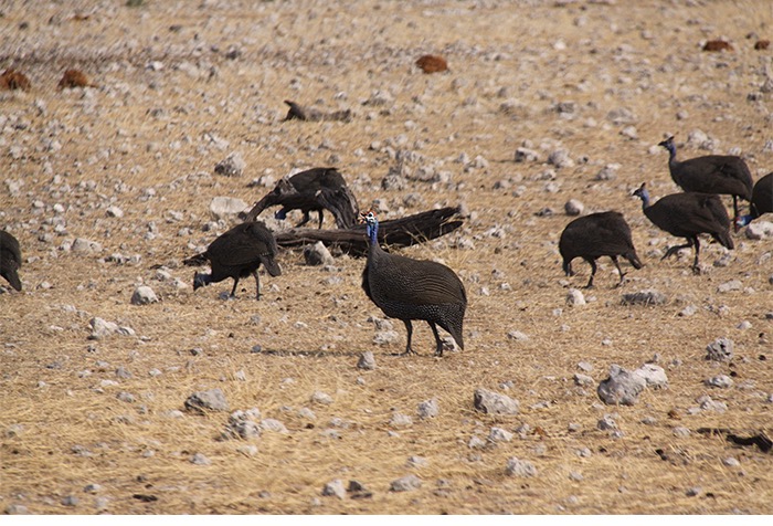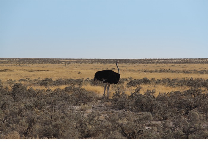 Am zweiten Tag im Park fuhren wir mit Sack und Pack von Wasserloch zu Wasserloch, beobachteten Löwen beim Jagdversuch, durchquerten eine riesige Herde Steppenzebras, erspähten Geparden unter einem etwas entfernten Baum der Mittagssonne trotzen, genossen den schier unendlichen Ausblick über die 5000 km2 große Etosha Salzpfanne, sichteten Vögel wie den hünenhaften Sekretär, die Riesentrappe, den hübschen Gelbschnabeltoko oder die herrlich hoppelnden Helm-Perlhuhnfamilien. Gegen Nachmittag bauten wir nun unser Camp in Namutoni auf und freuten uns alle, dass es ein Zuhause für satte zwei Nächte sein sollte.