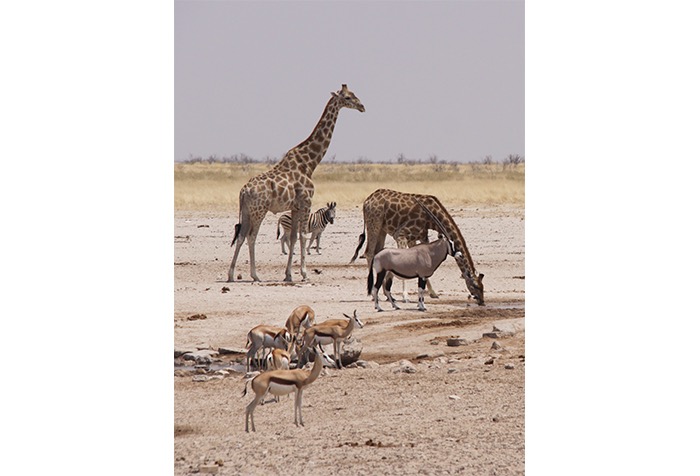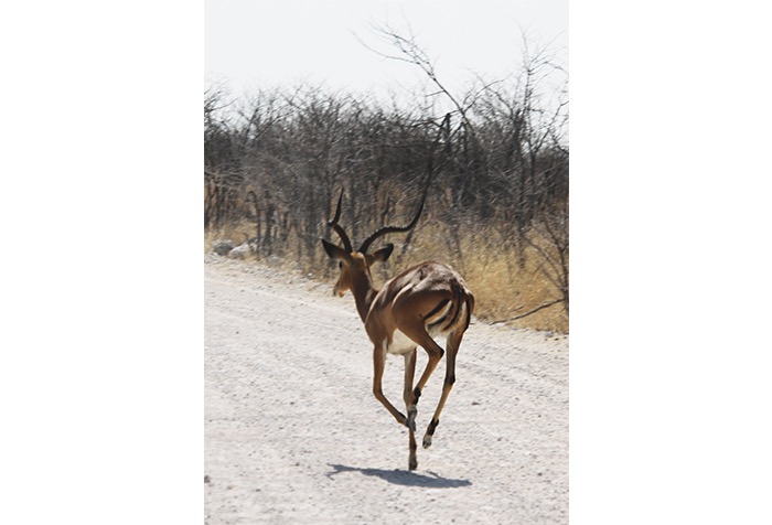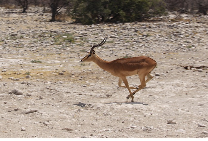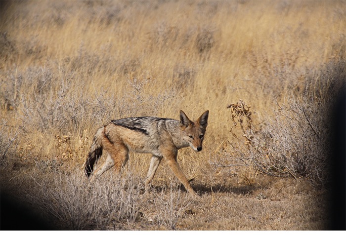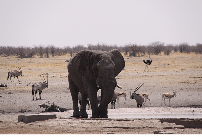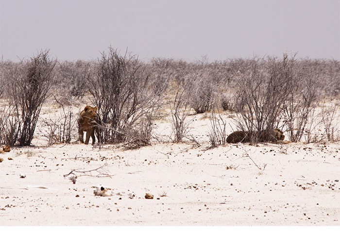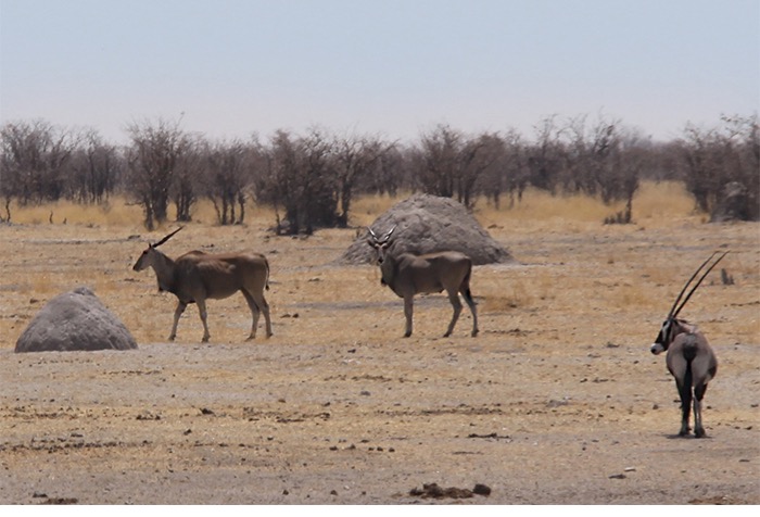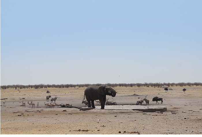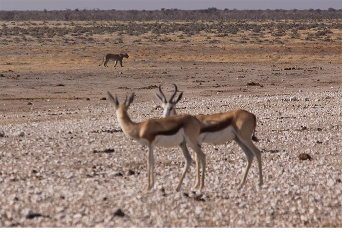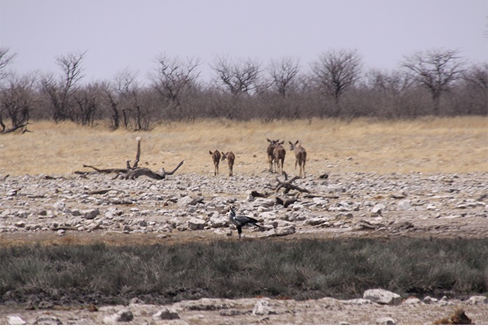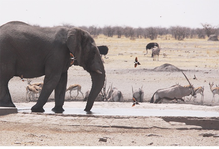 Nach den Wochen voller Weite und Kargheit wurden wir gleich am nächsten Morgen am ersten Wasserloch des Etosha Parks mit einer Fülle von Tierarten belohnt! Löwen, Zebras, Gnus, verschiedene Antilopen, Springböcke, Strauße, Gänse, Elstern, Finkenschwärme, Reiher, ein Schakal und dieser ominöse Fels, der plötzlich seine Öhrchen bewegte und seine die Nase zierenden Hörner zu erkennen gab. Was ein Start!