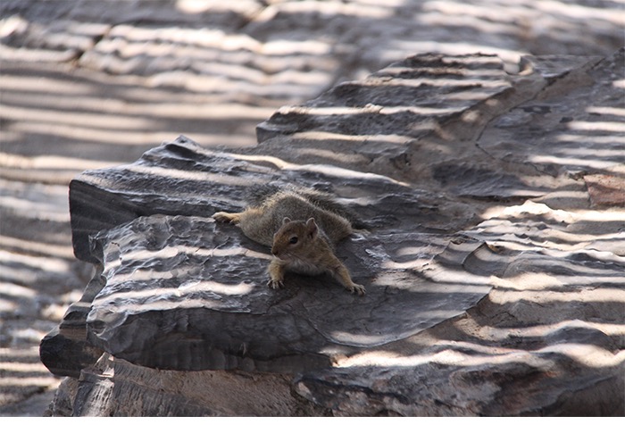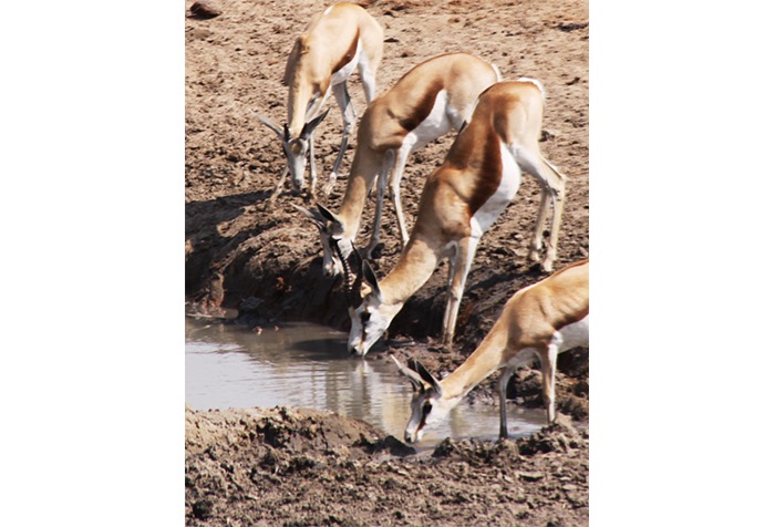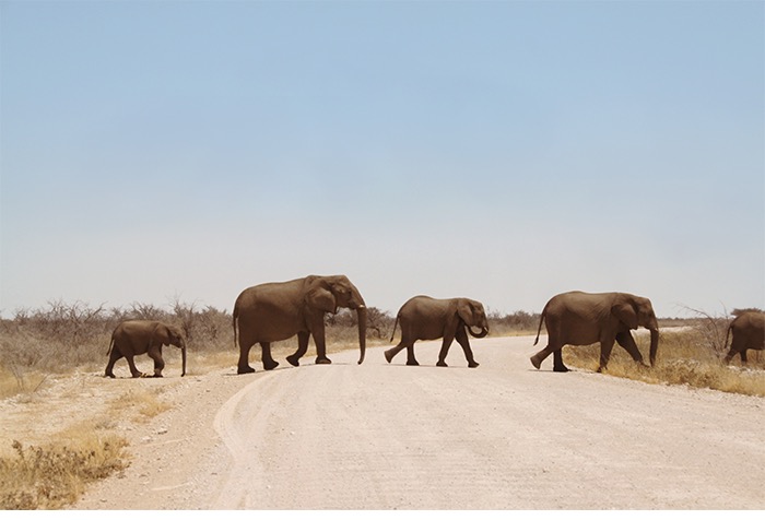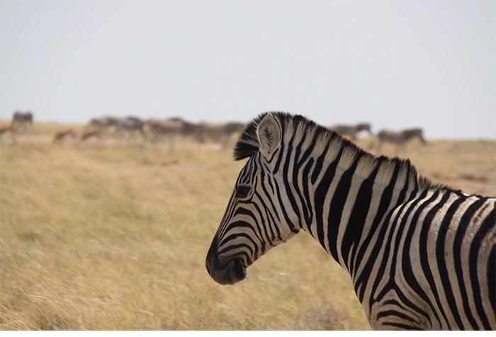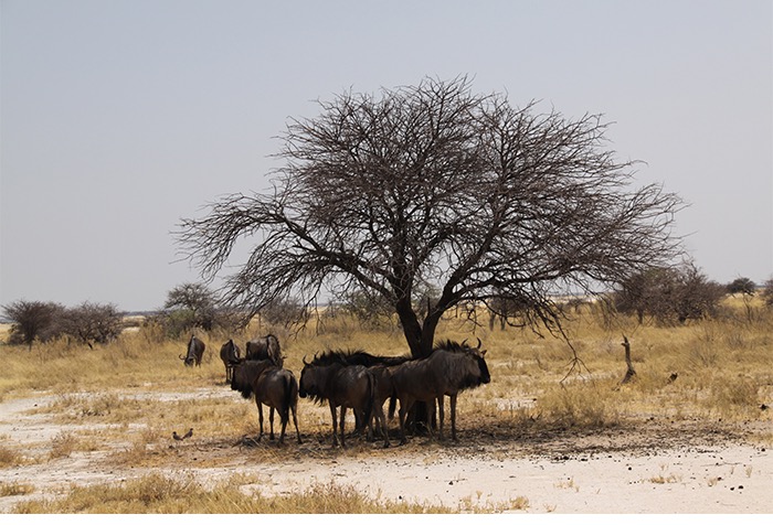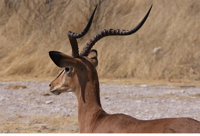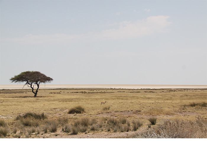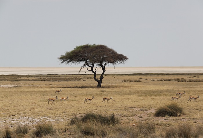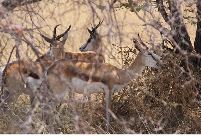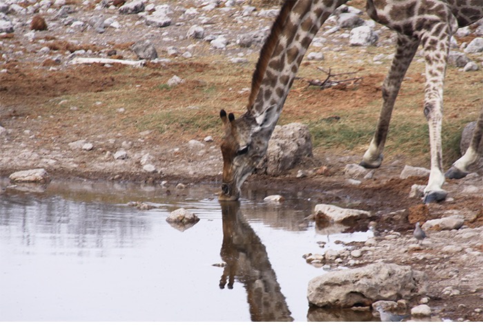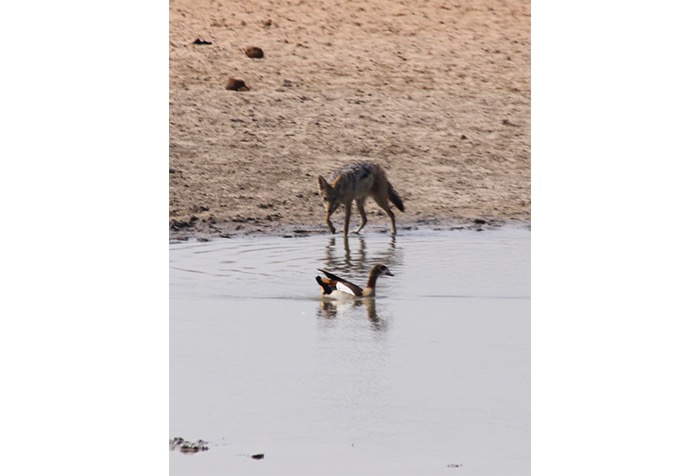 Nach den Wochen voller Weite und Kargheit wurden wir gleich am nächsten Morgen am ersten Wasserloch des Etosha Parks mit einer Fülle von Tierarten belohnt! Löwen, Zebras, Gnus, verschiedene Antilopen, Springböcke, Strauße, Gänse, Elstern, Finkenschwärme, Reiher, ein Schakal und dieser ominöse Fels, der plötzlich seine Öhrchen bewegte und seine die Nase zierenden Hörner zu erkennen gab. Was ein Start!