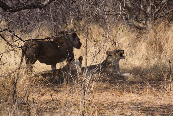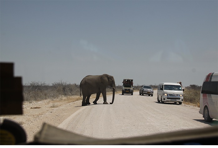 Der Tag startete also wunderbar mit einem prachtvollen Leoparden im Baum, danach beobachteten wir eine Weile sieben Giraffen beim Trinken und Flirten und konnten sogar den Kopf einer Felsenpython im Wasser ruhend ausmachen. Weiter ging es nach Norden, wo uns einige Löwen unmittelbar neben der Pad erfreuten. Kurz darauf hatten wir dann gleich das Glück ein paar Geparden von ganz nah zu erleben. Nachdem uns dann noch ein riesiger Elefantenbulle auf der Straße entgegenkam, konnten uns die zahlreichen anderen Tiere nicht mehr so recht aus der Ruhe bringen.