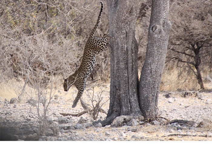 Diese schöne Nacht wurde jäh um 4:45 Uhr unterbrochen als die ersten Camps noch vor Sonnenaufgang eilig abgebaut und verpackt wurden, um auch das nächste ehrgeizige Tagesziel zu erreichen. Wir aber hatten ein entspanntes Frühstück mit Rührei, Würstchen und Bratkartoffeln geplant. Doch bevor diese Essensmassen ansatzweise verdaut werden konnten, erreichte uns ein Anruf: Leopard gesichtet nahe des Wasserlochs Klein-Namutoni! Los ging es!